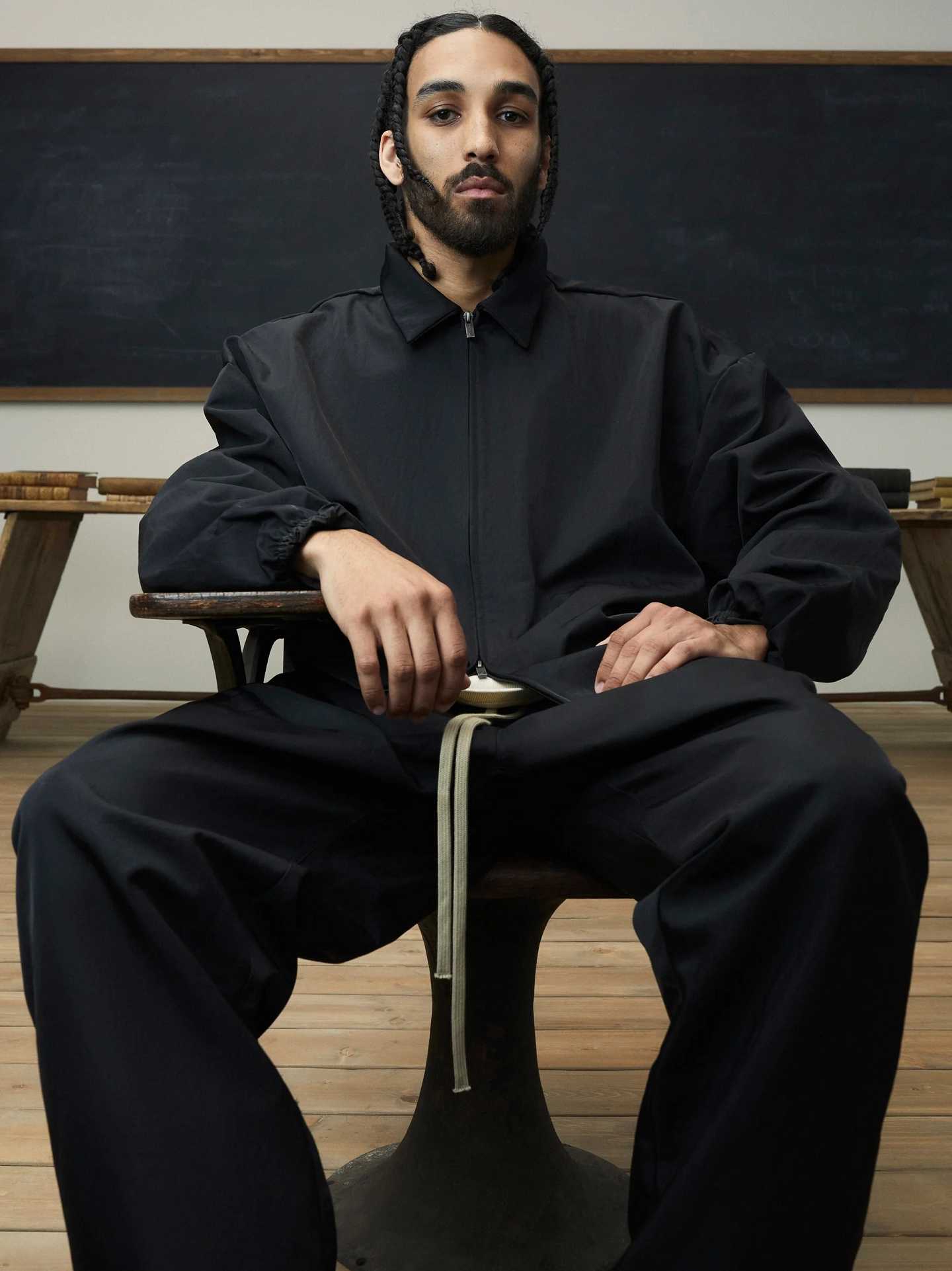 FEAR OF GOD ESSENTIALS 24FW stand collar windbreaker with appliqué letter embroidery.